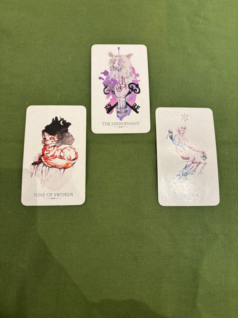 With a three-card reading, I’ll usually use a spread like: Embrace/ Release/ Remember or Problem/ Solution/ Guidance.